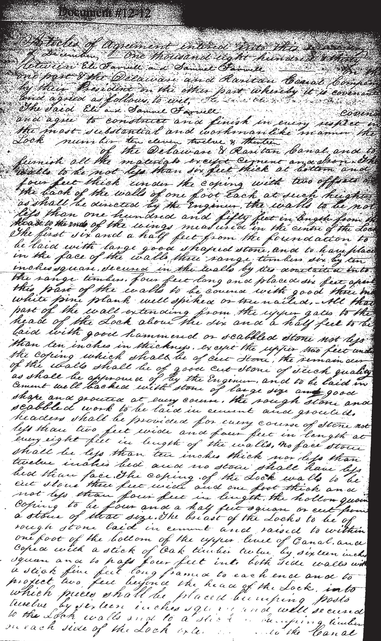 The said Eli and Samuel Farwell [space left blank] convene and agree to construct and finish in every respect in the most substantial and workmanlike manner the Lock number ten eleven twelve + thirteen [space left blank] of the Delaware and Raritan Canal and to furnish all the materials except cement and iron. The walls to be not less than six feet thick at bottom and four feet thick under the coping with two offsets on the back of the walls of one foot each at such heights as shall be directed by the Engineer, the walls to be not less than one hundred and fifty feet in length from the head to the ends of the wings measured in the centre of the Lock. The first six and a half feet from the foundation to be laid with large good shaped stone, and to have placed in the face of the walls three range timbers six by ten inches square, secured in the walls by ties dovetailed into the range timbers, four feet long and placed six feet apart, this part of the walls to be covered with good three inch [word cut off, possibly inch] white pine plank well spiked or treenailed. All that part of the wall extending from the upper gates to the head of the Lock above the six and a half feet to be laid with good hammered or scabbled stone not less than ten inches in thickness, except the upper two feet and the coping which shall be of cut stone, the remainder of the walls shall be of good cut stone such quality as shall be appraised of by the Engineer, and to be laid in cement well backed with stone of large size and good shape and grouted at every course, the rough stone and scabbled work to be laid in cement and grouted, headers shall be provided for every course of stone not less than two feet wide and four feet in length at every eight feet in length of the walls. No face stone shall be less than ten inches thick nor less than twelve inches bed and no stone shall have less bed than face.