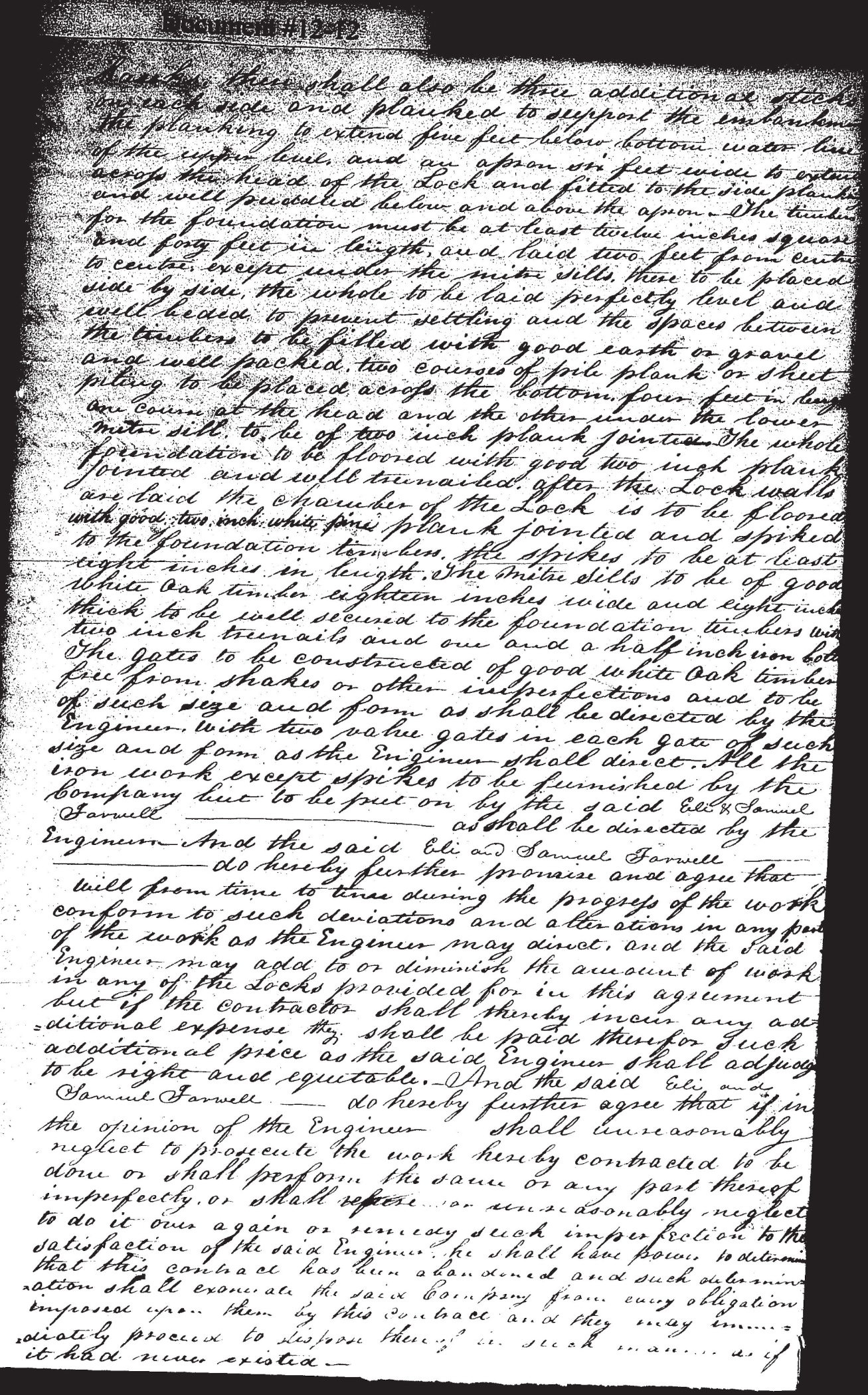 The coping of the Lock walls to be cut stone three feet wide and one foot thick and not less than four and a half feet in length, the hollow quoin coping to be four and a half feet square or cut from a stone of that size. The breast of the Locks to be of rough stone laid in cement and raised to within one foot of the bottom of the upper level of Canal and coped with a stick of Oak timber twelve by sixteen inches square and to pass four feet into both side walls with a stick five feet long framed to each end and to project two feet beyond the head of the Lock into which pieces shall be placed bumping posts twelve by sixteen inches square and well secured to the Lock walls and to a stick [blank] bumping timber on each side of the Lock extending to the Canal banks, there shall also be three additional sticks on each side and planked to support the embankment, the planking to extend five feet below bottom water line of the upper level, and an apron six feet wide to extend across the head of the dock and fitted to the side planking and well puddled below and above the apron. The timbers for the foundation must be at least twelve inches square and forty feet in length and laid two feet from center to center, except under the miter sills, these to be placed side by side, the whole to be laid perfectly level and well beded to prevent settling and the spaces between the timbers to be filled with good earth or gravel and well packed, two causes of pile plank or sheet piling to be placed across the bottom, four feet in length one course at the head and the other under the lower miter sill, to be of two inch plank jointed.The whole foundation to be floored with good two inch plank jointed and well tree-nailed, after the Lock walls are laid the chamber of the Lock is to be floored with good two inch white pine plank jointed and spiked to the foundation timbers, the spikes to be at least eight inches in height. The mitre sills to be of good white oak timber eighteen inches wide and eight inches thick to be well secured to the foundation timbers with two-inch treenails and one and a half inch iron bolt. The gates to be constructed of good white oak timbers free from shakes or other imperfections and to be of such size and form as shall be directed by the Engineer, with two valve gates in each gate of such size and form as the Engineer shall direct. All the iron work except spikes to be furnished by the Company but to be put on by the said Eli & Samuel Farwell [space] as shall be directed by the Engineer. And the said Eli and Samuel Farwell [space] do hereby further promise and agree that will from time to time during the progress of the work conform to such deviations and alterations in any part of the work as the Engineer may direct, and the said Engineer may add to or diminish the account of work in any of the Locks provided for in this agreement but if the contractor shall thereby incur any additional expense they shall be paid therefore such additional price as the said Engineer shall adjudge to be right and equitable. And the said Eli and Samuel Farwell [space] do hereby further agree that if in the opinion of the Engineer shall unreasonably neglect to prosecute the work hereby contracted to be done or shall perform the same or any part thereof imperfectly, or shall refuse or unreasonably neglect to do it over again or remedy such imperfections to the satisfaction of the said Engineer, he shall have power to determine that this contract has been abandoned and such determination shall exonerate the said Company from every obligation imposed upon them by this contract and they may immediately proceed to dispose thereof in such manner as if it had never existed.