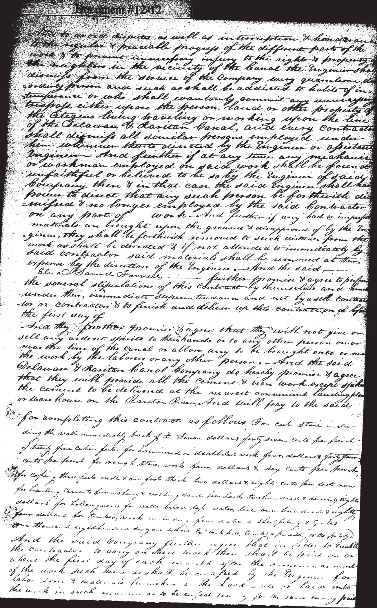 And to avoid disputes as well as interruption & hinderances to the regular & peaceable progress of the different parts of the work & to prevent unnecessary injury to the rights & prosperity of the neighbors in the vicinity of the Canal the Engineer shall dismiss from the service of the Company every quarrelsome disorderly person and such as shall be addicted to habits of interference or who shall eventually commit any unnecessary trespass, either upon the person, land, or other property of the citizens living traveling or working upon the line of the Delaware & Raritan Canal, and every contractor shall dismiss all similar persons employed under him whenever thereto directed by the Engineer or assistant Engineer. And further if at any time any mechanic or workman employed on said work shall be found unfaithful or believed to be so by the Engineer of said Company then & in that case the said Engineer shall have power to direct that any such person be forthwith dismissed & no longer employed by the said Contractor on any part of [blank space] work. And further if any bad or imperfect materials are brought upon the ground & disapproved of by the Engineer they shall be forthwith removed to such distance from the work as shall be directed & if not attended to immediately by said contractor said materials shall be removed at their expense by the direction of the Engineer. And the said [space] Eli and Samuel Farwell [space] further promise & agree to perform the several stipulations of this contract by themselves and handle under their immediate superintendance and not by a sub contractor or contractors & to finish and deliver up this contraction or before the first day of.