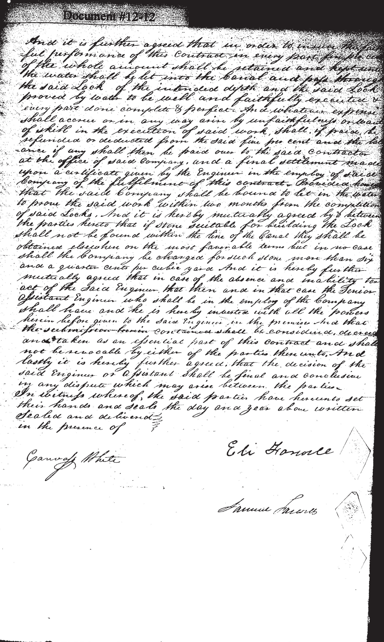 And it is further agreed that in order to ensure the faithful performance of this contract in every part five percent of the whole amount shall be retained and kept until the water shall be let into the Canal and pass through the said Lock of the intended depth and the said Lock proved by water to be well and faithfully executed & every part done complete & perfect. And whatever expense shall accrue or in any way arise by unfaithfulness or want of skill in the execution of said work shall if paid be refunded or deducted from the said five per cent and the balance if any shall then be paid over to the said contractor at the office of said Company, and a final settlement made upon a certificate given by the Engineer in the employ of said Company of the fulfillment of this contract. Provided that the said Company shall be bound to let in the water to prove the said work within two months from the completion of said Locks. And it is hereby mutually agreed by & between the parties hereto that if stone suitable for building the Lock shall not be found within the line of the Canal they shall be obtained elsewhere on the most favorable terms but in no case shall the Company be charged for such stone more than six and a quarter cents per cubic yard. And it is hereby further mutually agreed that in case of the absence and inability to act of the said Engineer that then and in that case the Junior Assistant Engineer who shall be in the employ of the Company shall have and he is hereby invested with all the powers herein before given to the said Engineer in the premise. And that the [unclear word, looks like “submissore”] herein contained shall be considered decreed and taken as an essential part of this contract and shall not be removable by either of the parties there unto. And lastly it is hereby further agreed that the decision of the said Engineer or Assistant shall be final and conclusive in any dispute which may arise between the parties. In witness whereof, the said parties have hereunto set their hands and seals the day and year above written sealed and delivered